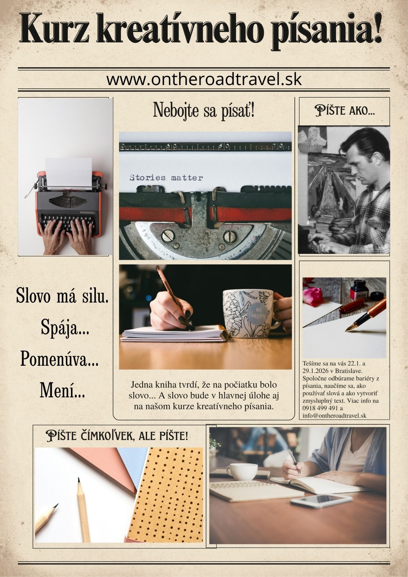 Na kurzoch kreatívneho písania vás prevedieme cvičeniami, ktoré podporia vašu predstavivosť, spontánnosť aj schopnosť vyjadriť vlastný hlas. Nech už túžite začať písať poviedky, rozvíjať fantáziu alebo si jednoducho dopriať tvorivý oddych, kurz je otvorený pre každého.